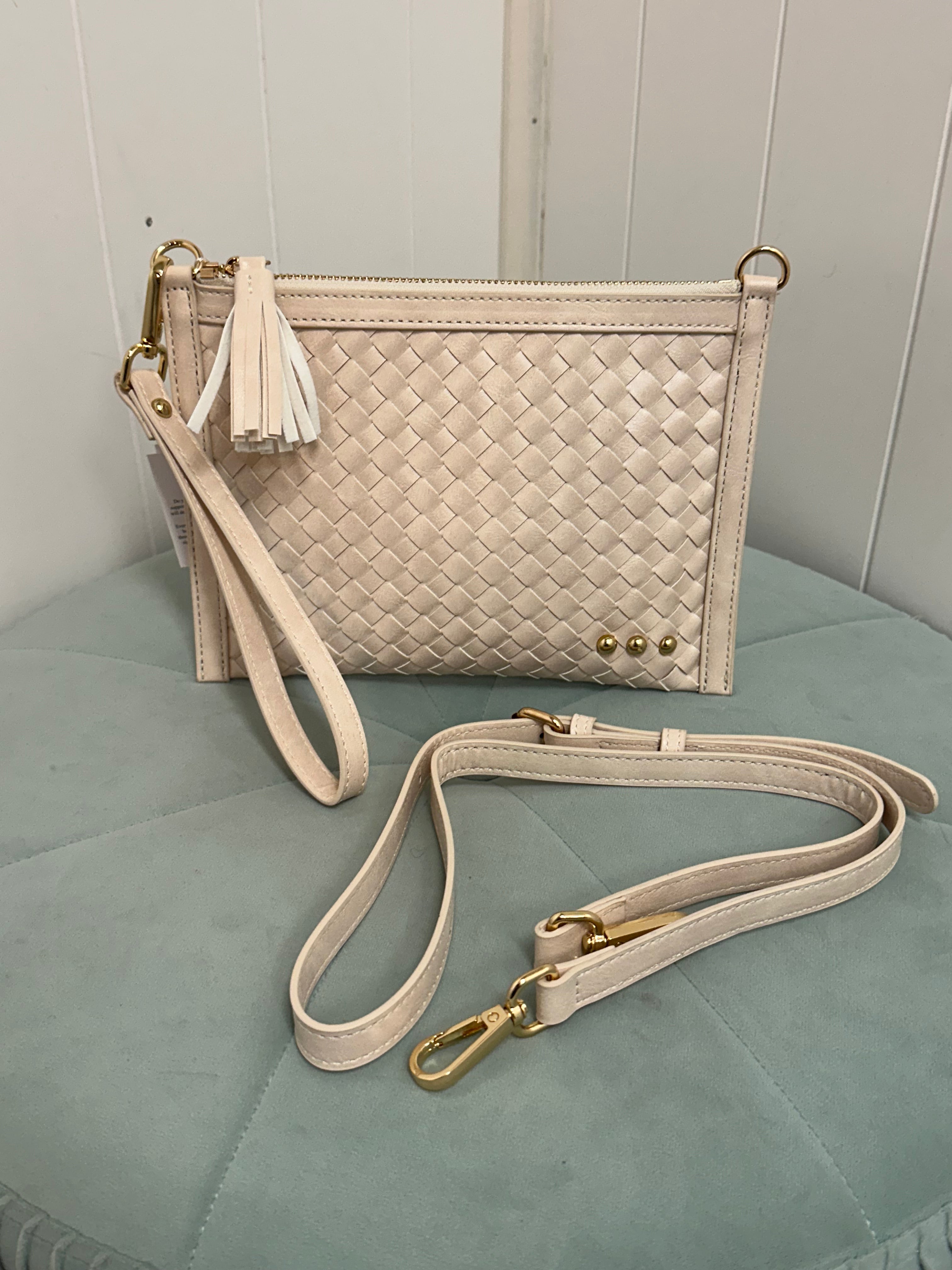 Make a statement with the Veda Woven Crossbody and Clutch Bag. Crafted from premium vegan leather, this versatile bag has a wristlet strap inside and an interior card holder for convenience.