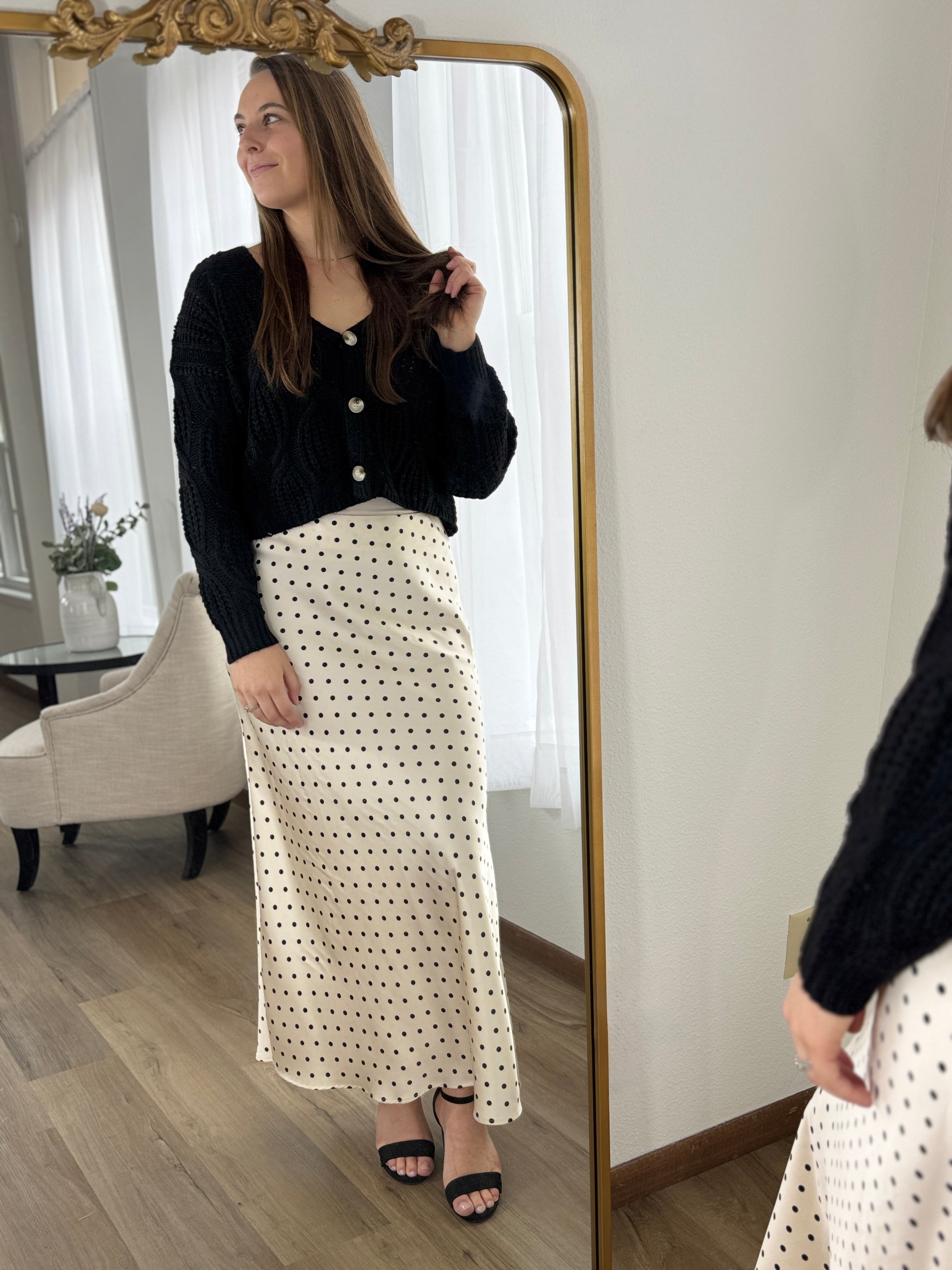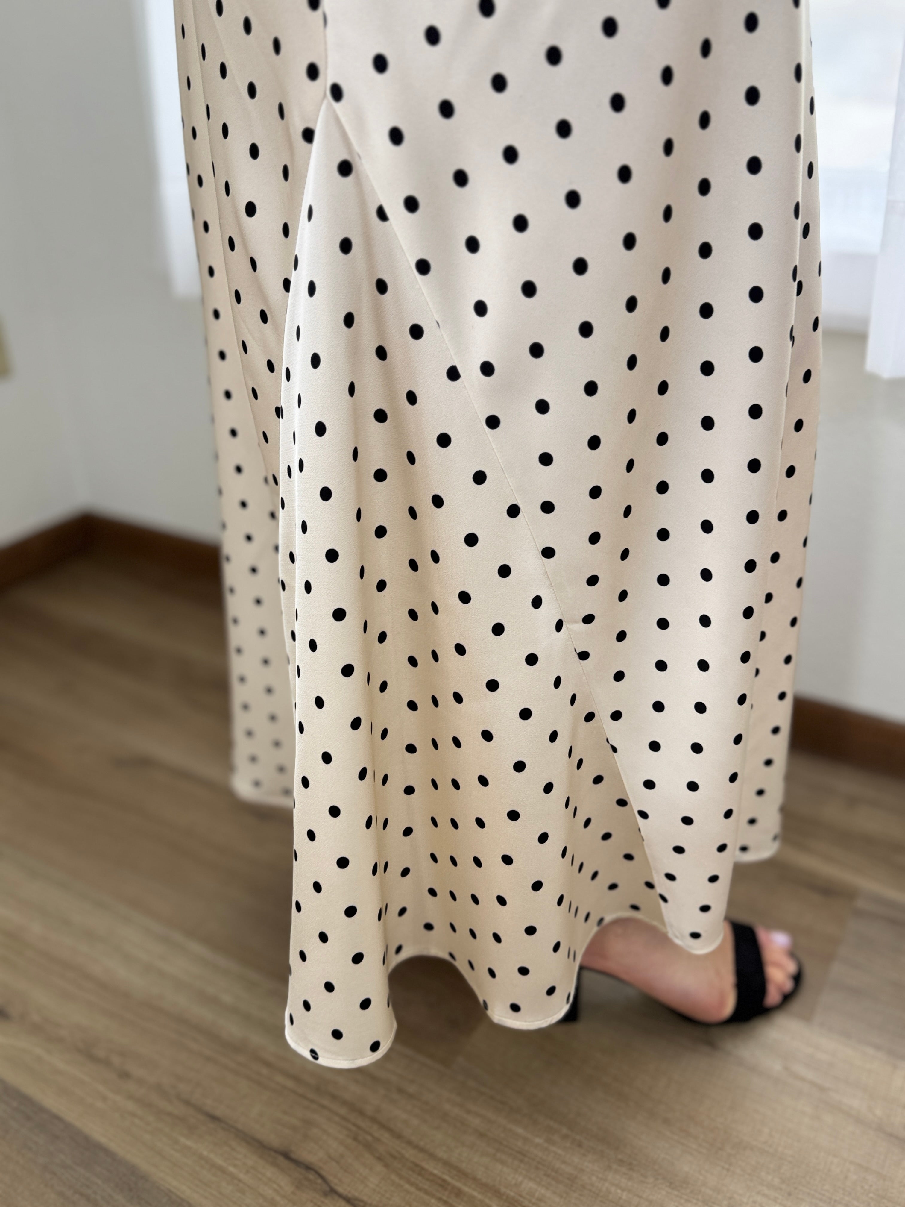 Elevate your wardrobe with this elegant champagne maxi skirt featuring timeless black polka dots. Its fluid, high-waist silhouette offers effortless sophistication for weddings, dates, or chic daily wear. Feel undeniably radiant and graceful with every step.
