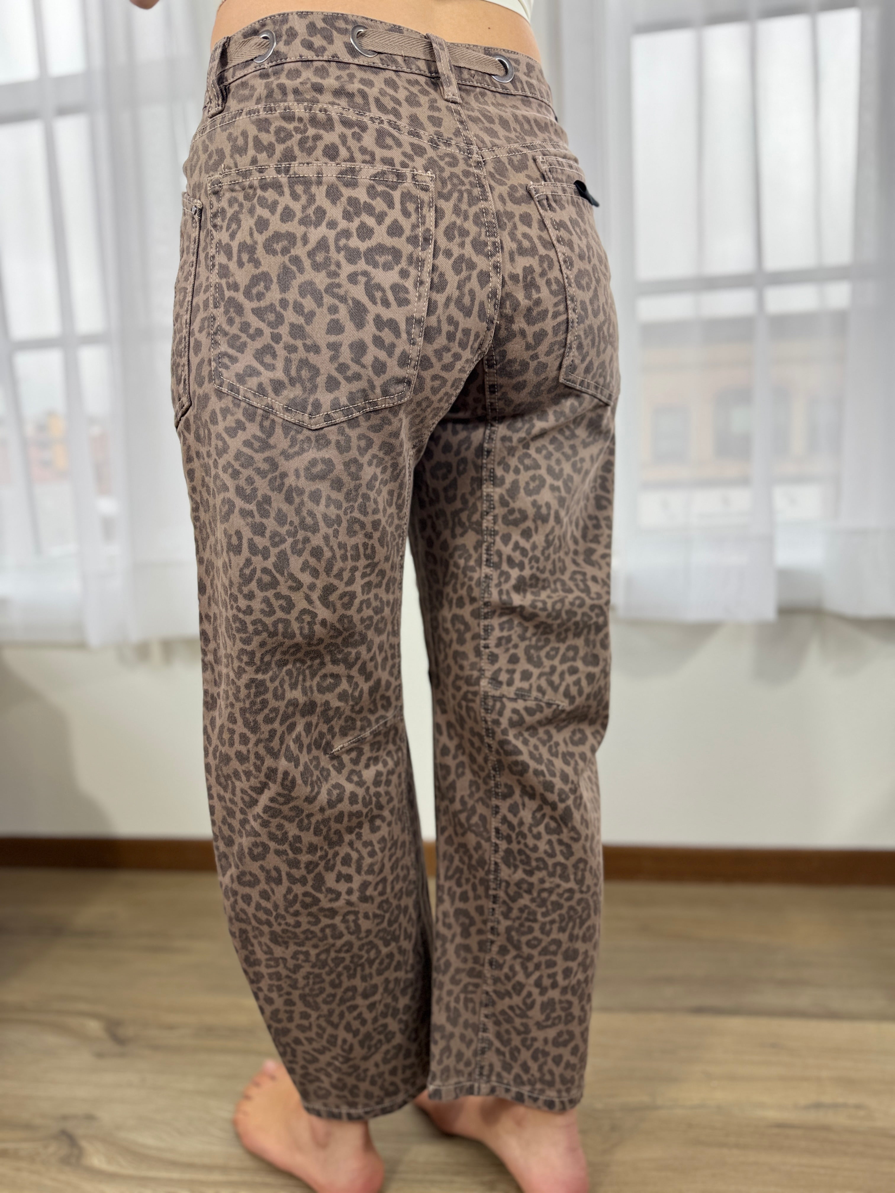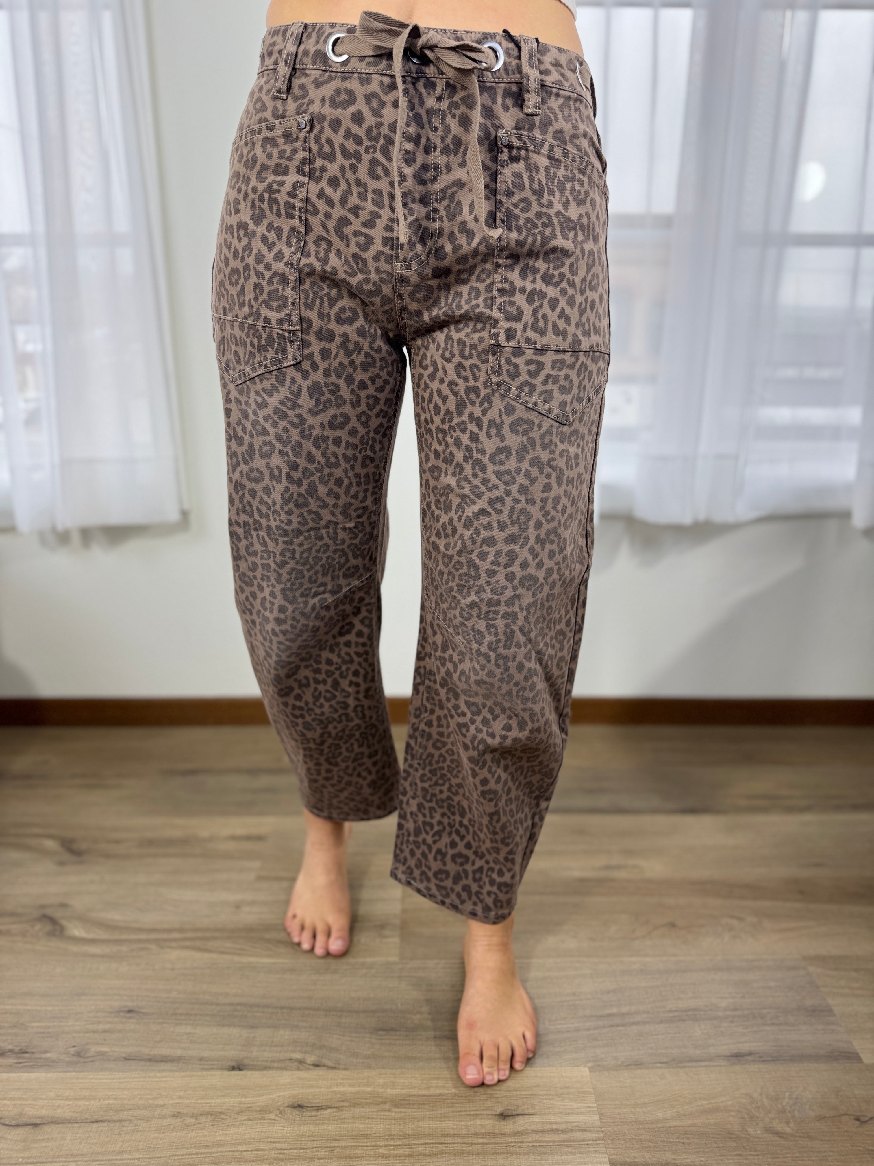 Make a fierce statement with the season's most-wanted silhouette. These leopard barrel pants combine a bold animal print with a relaxed, curved leg and an adjustable drawstring waist for the ultimate blend of high-fashion edge and effortless comfort.