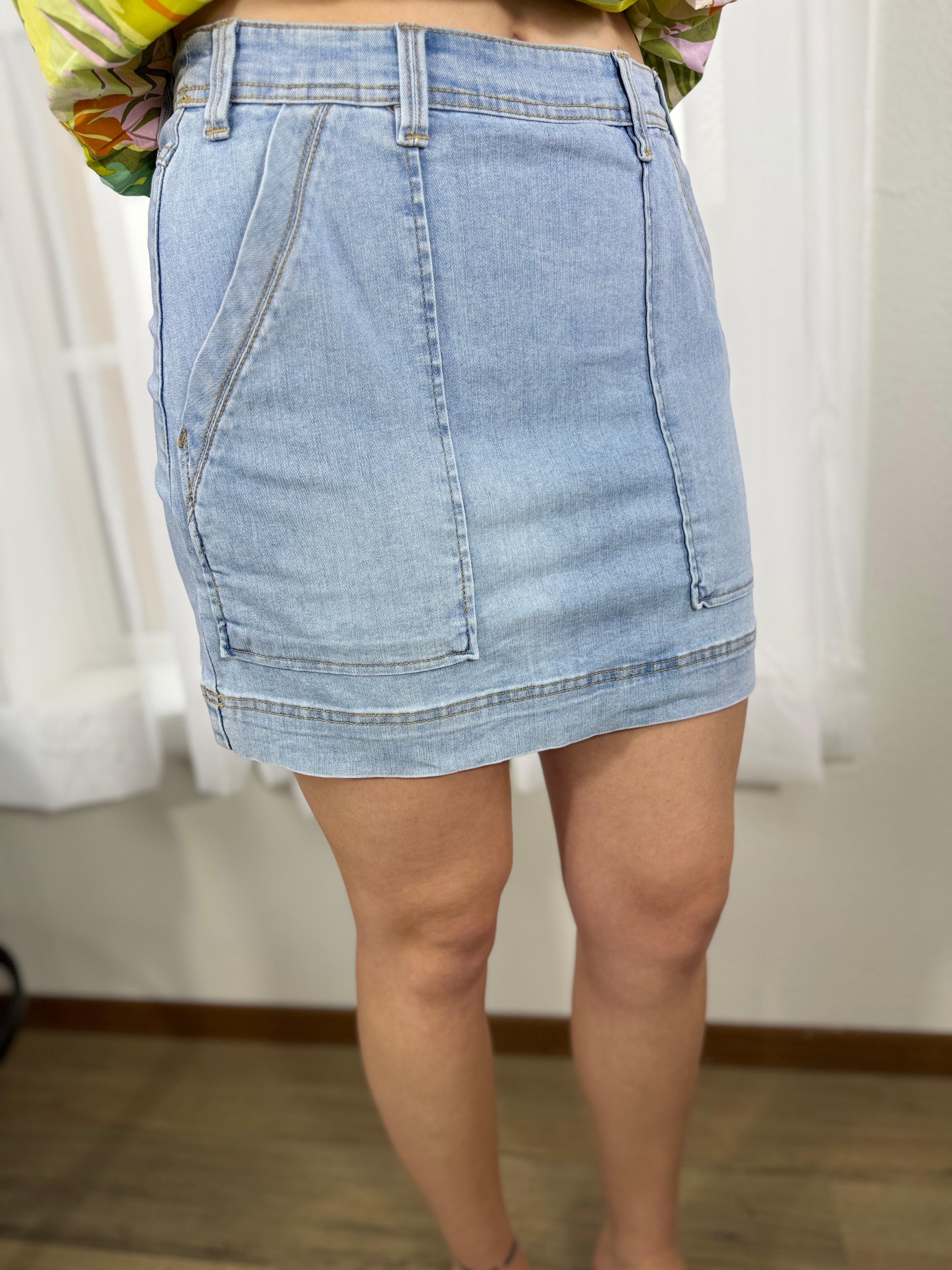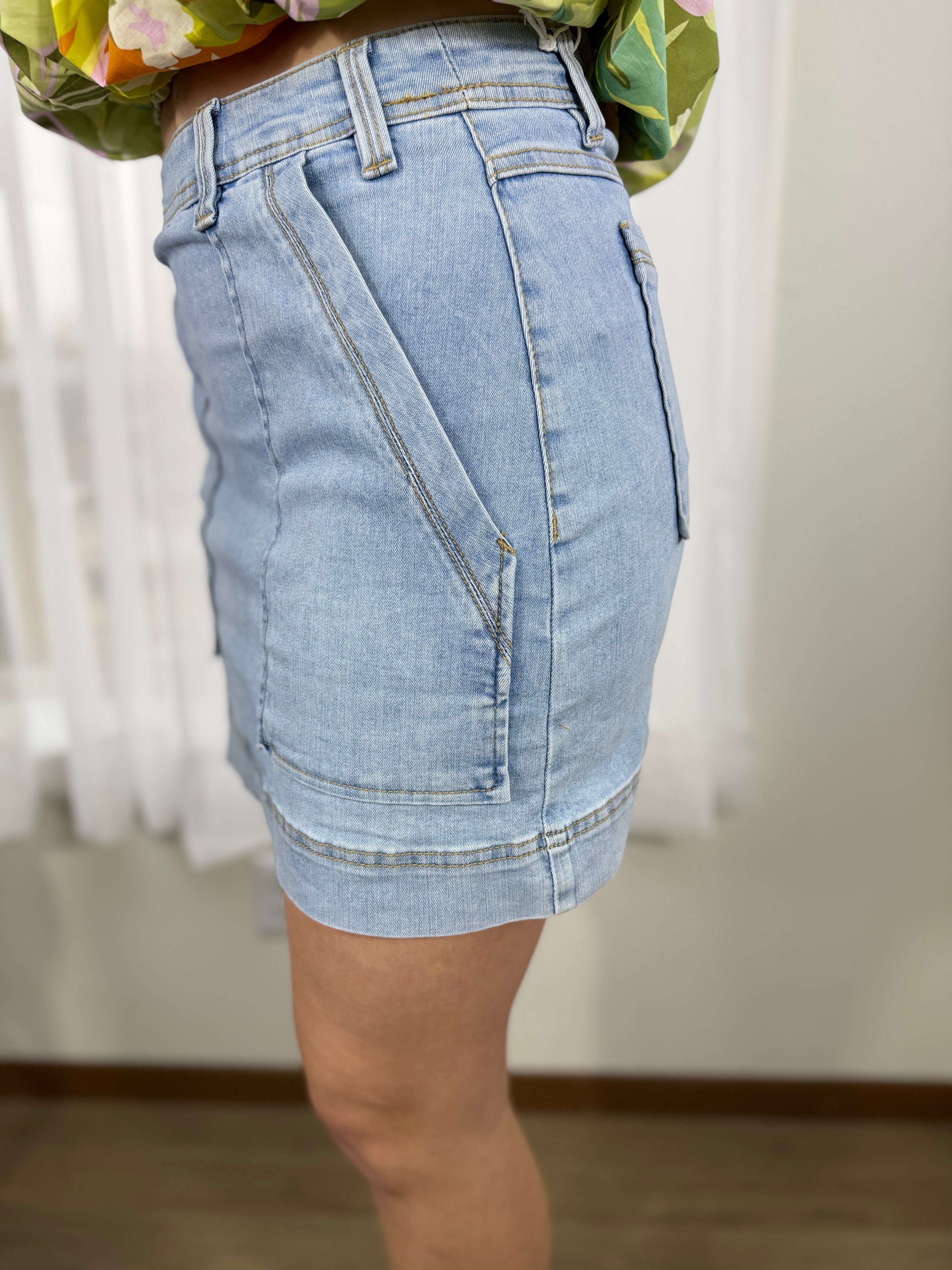 Experience the perfect blend of feminine skirt style and active short comfort with this Tribal Audrey skort. Crafted in a versatile light wash denim, the smooth pull-on waistband and chic patch pockets offer effortless, all-day sophistication.