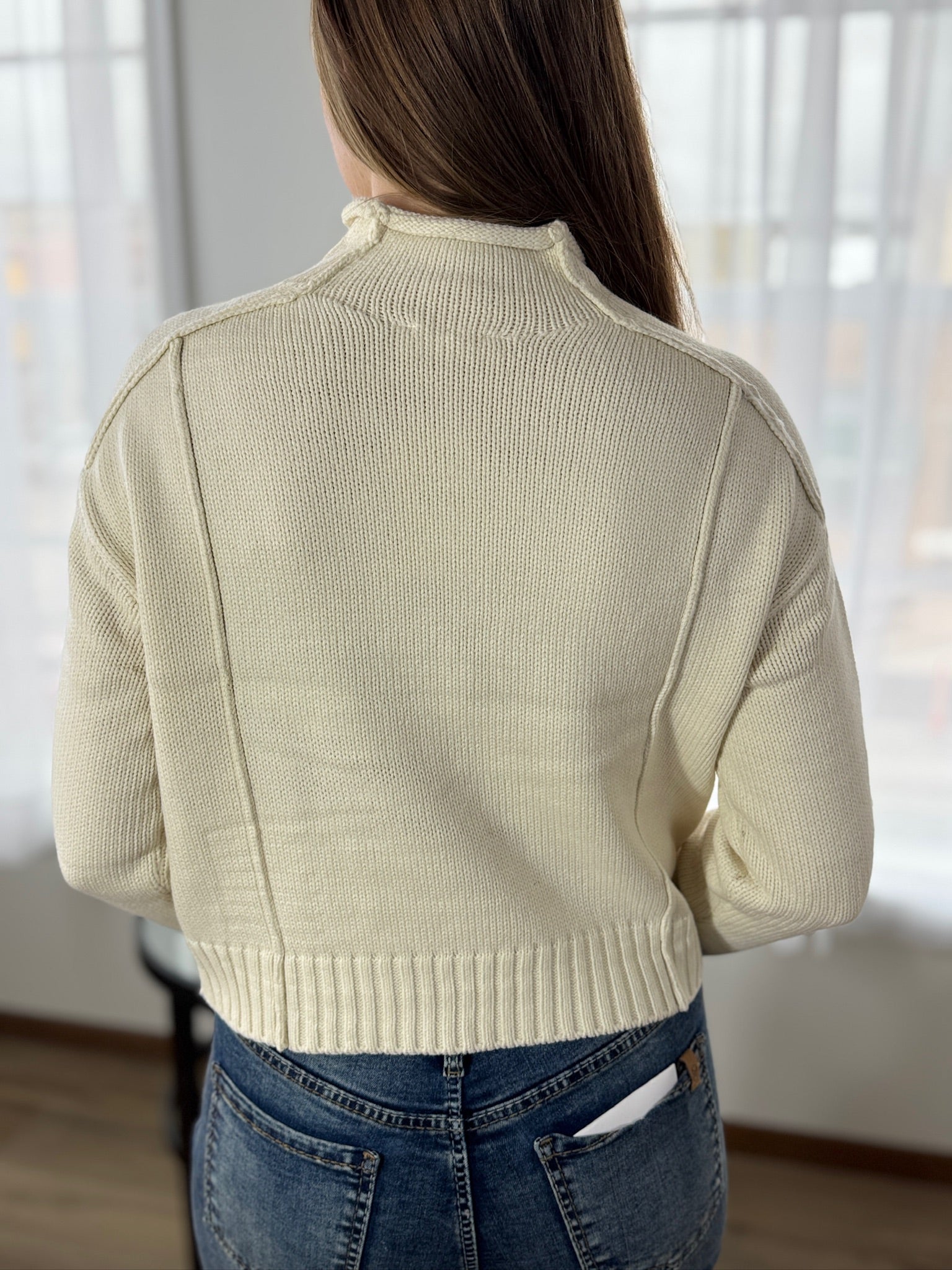 - Rolled high neckline
