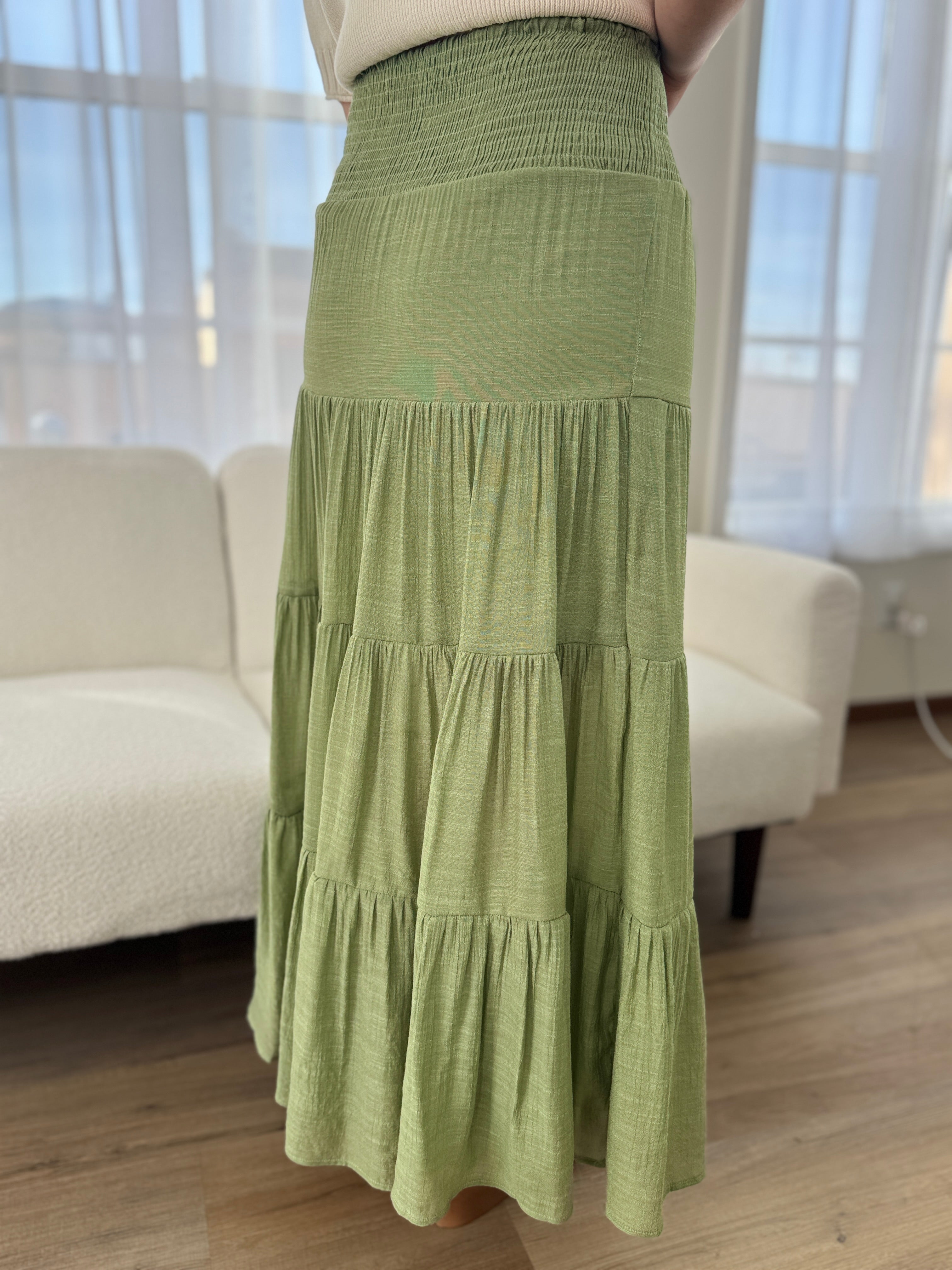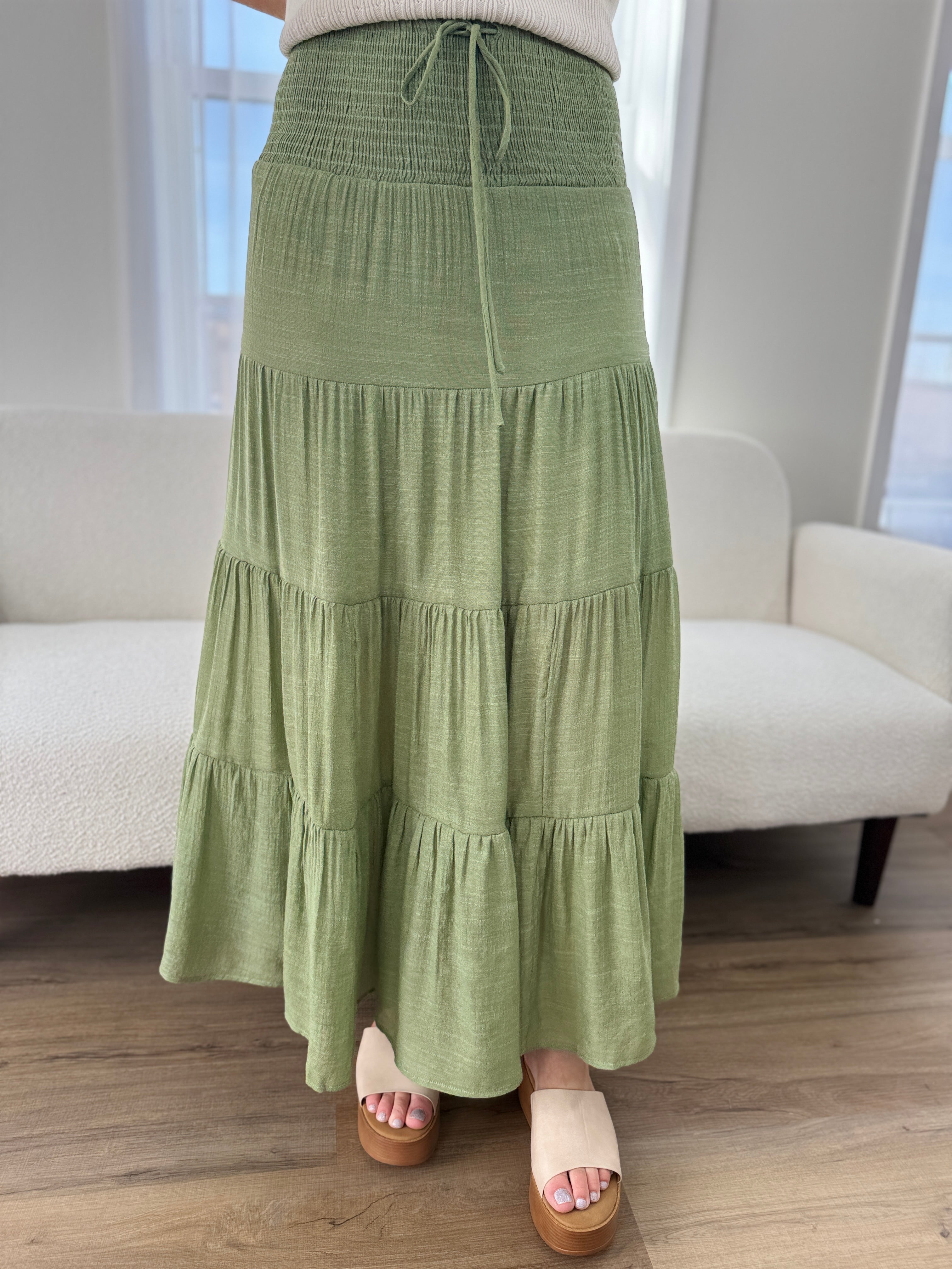 Embrace effortless elegance with the Genevieve Skirt. Designed in a rich, earthy olive green, this tiered maxi skirt features a lightweight, flowy silhouette that moves beautifully with every step. The comfortable smocked waist provides a flattering, flexible fit, while the adjustable drawstring adds a touch of bohemian charm. Whether you're heading to a weekend brunch or a sunset stroll, this versatile piece is your new go-to for breezy, feminine style.