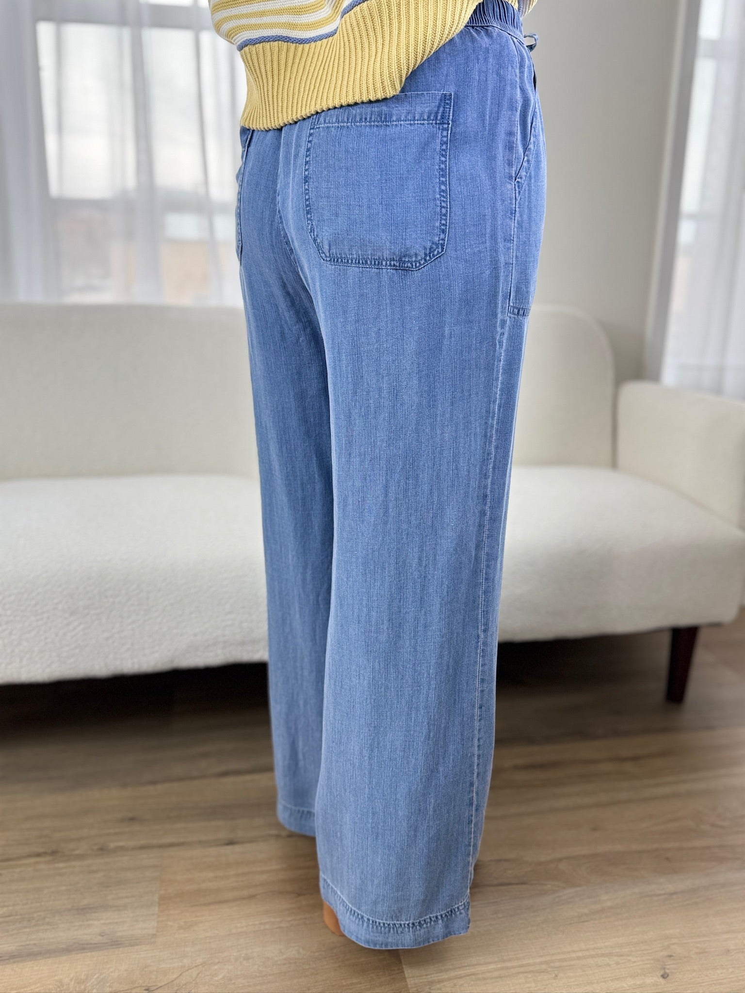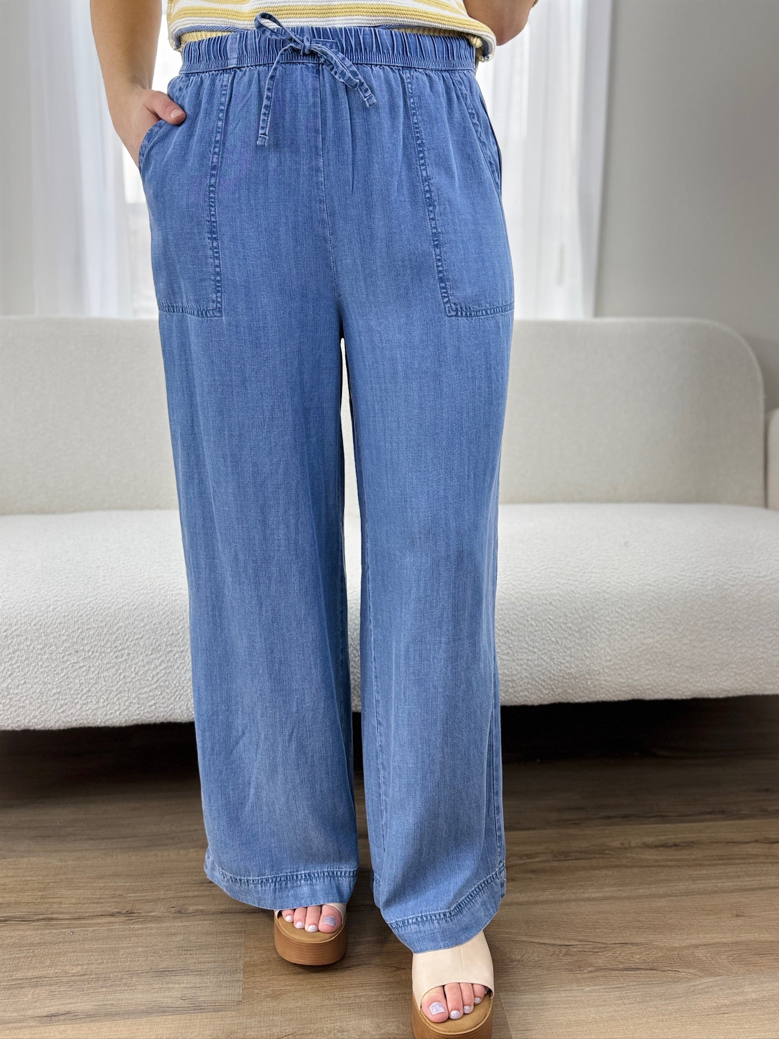 Experience the perfect blend of casual comfort and "cool-girl" chic with our Maxine Wide Leg Pants. Crafted from a lightweight, breathable blue chambray fabric, these pants feature a relaxed silhouette and an adjustable drawstring waist for an all-day custom fit. Whether you’re heading to a weekend brunch or a seaside stroll, these versatile blue trousers are the ultimate wardrobe staple for effortless, everyday style.