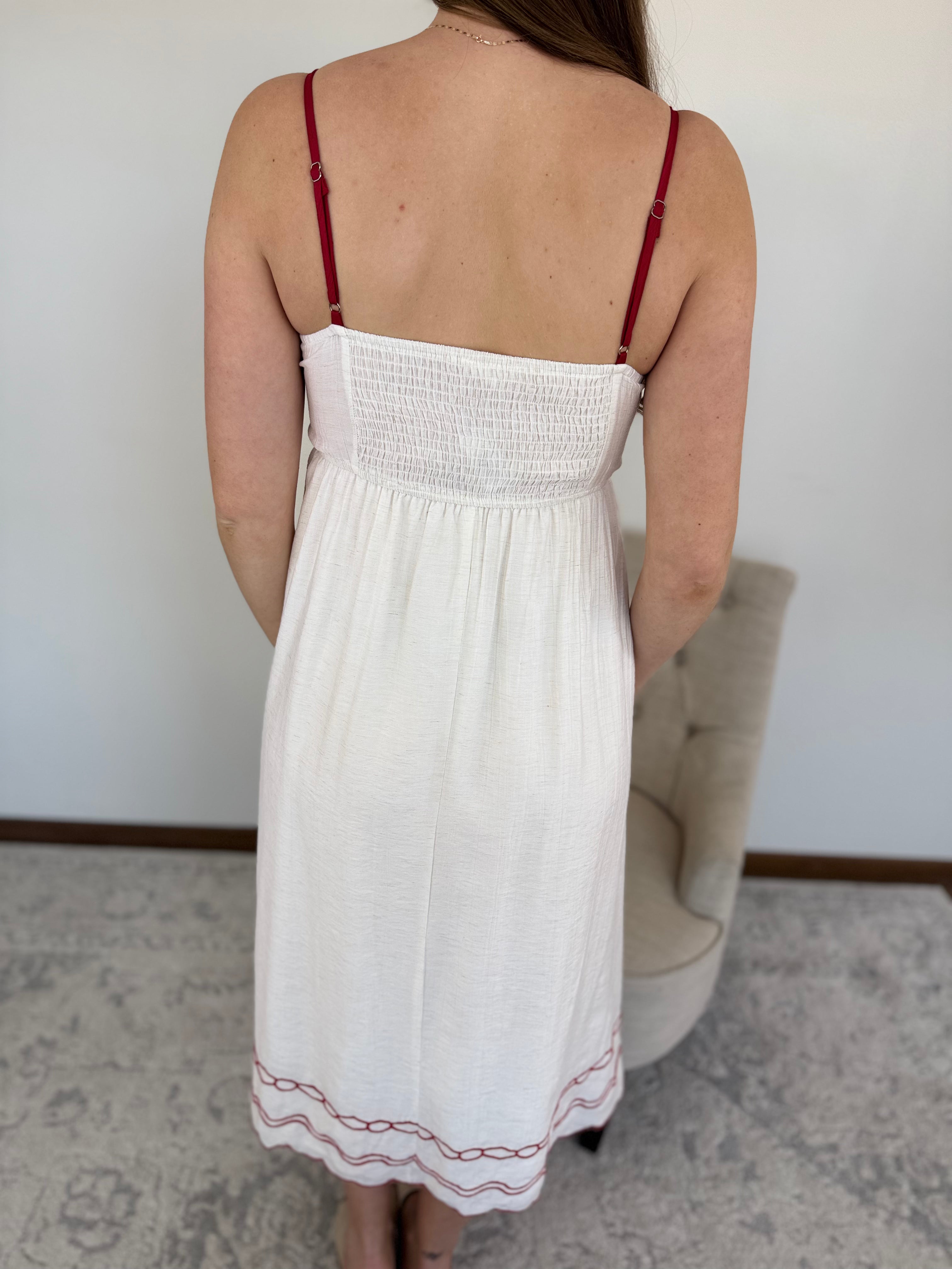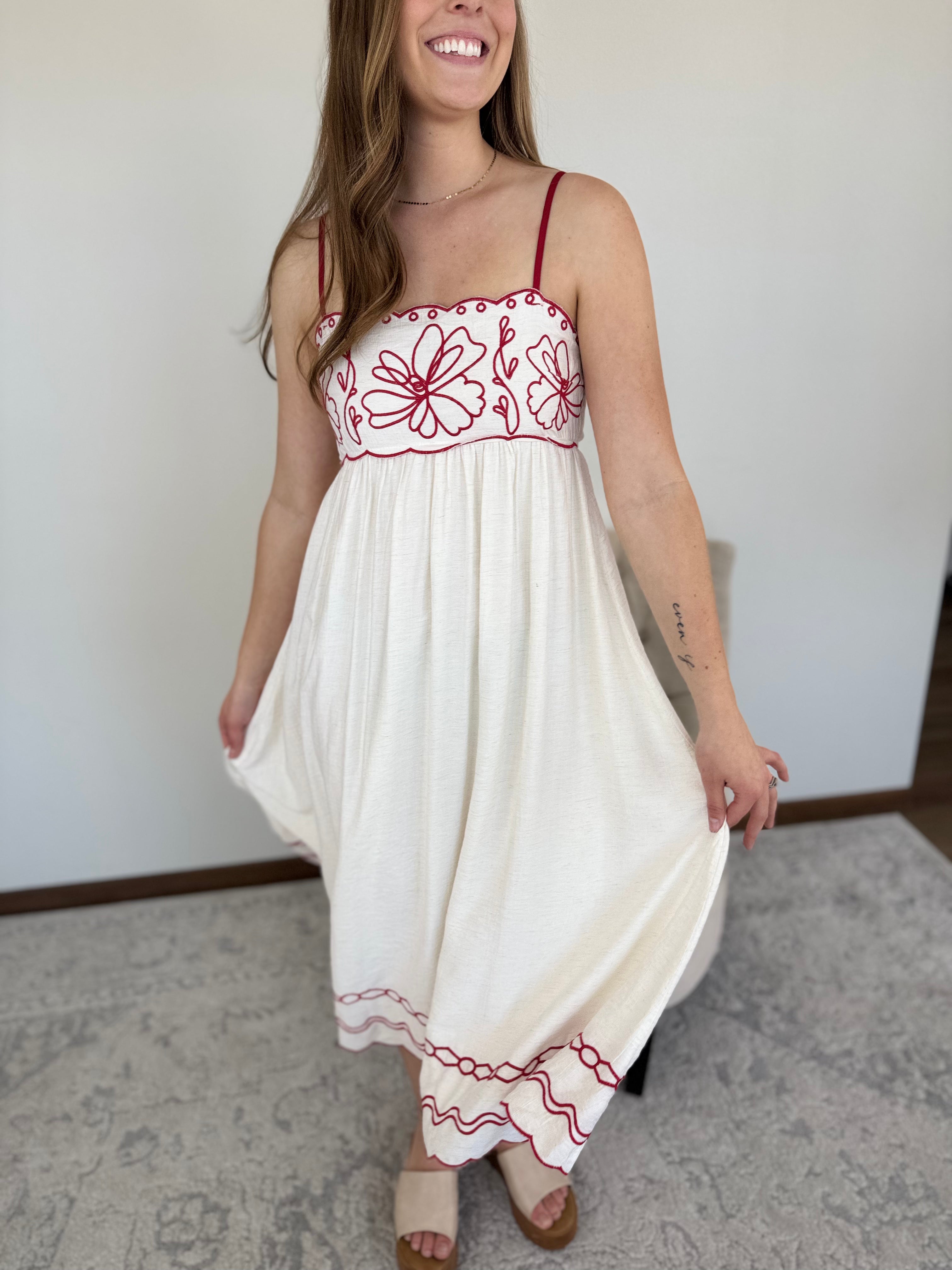 Embrace effortless elegance in this stunning white midi sundress featuring intricate red floral embroidery and a charming scalloped hemline. Designed with a breezy empire waist, it offers a flattering, sun-drenched silhouette perfect for your next outing.