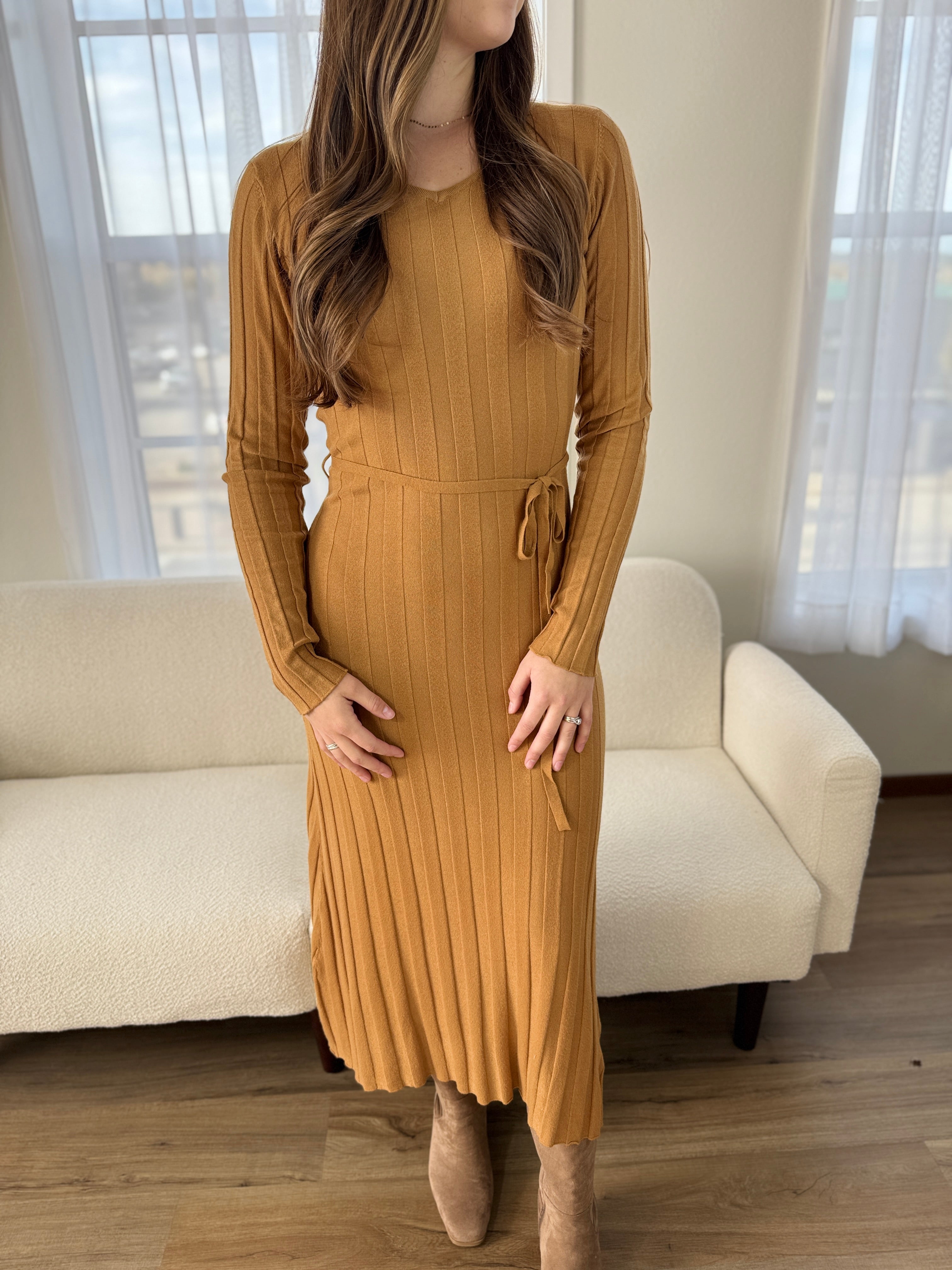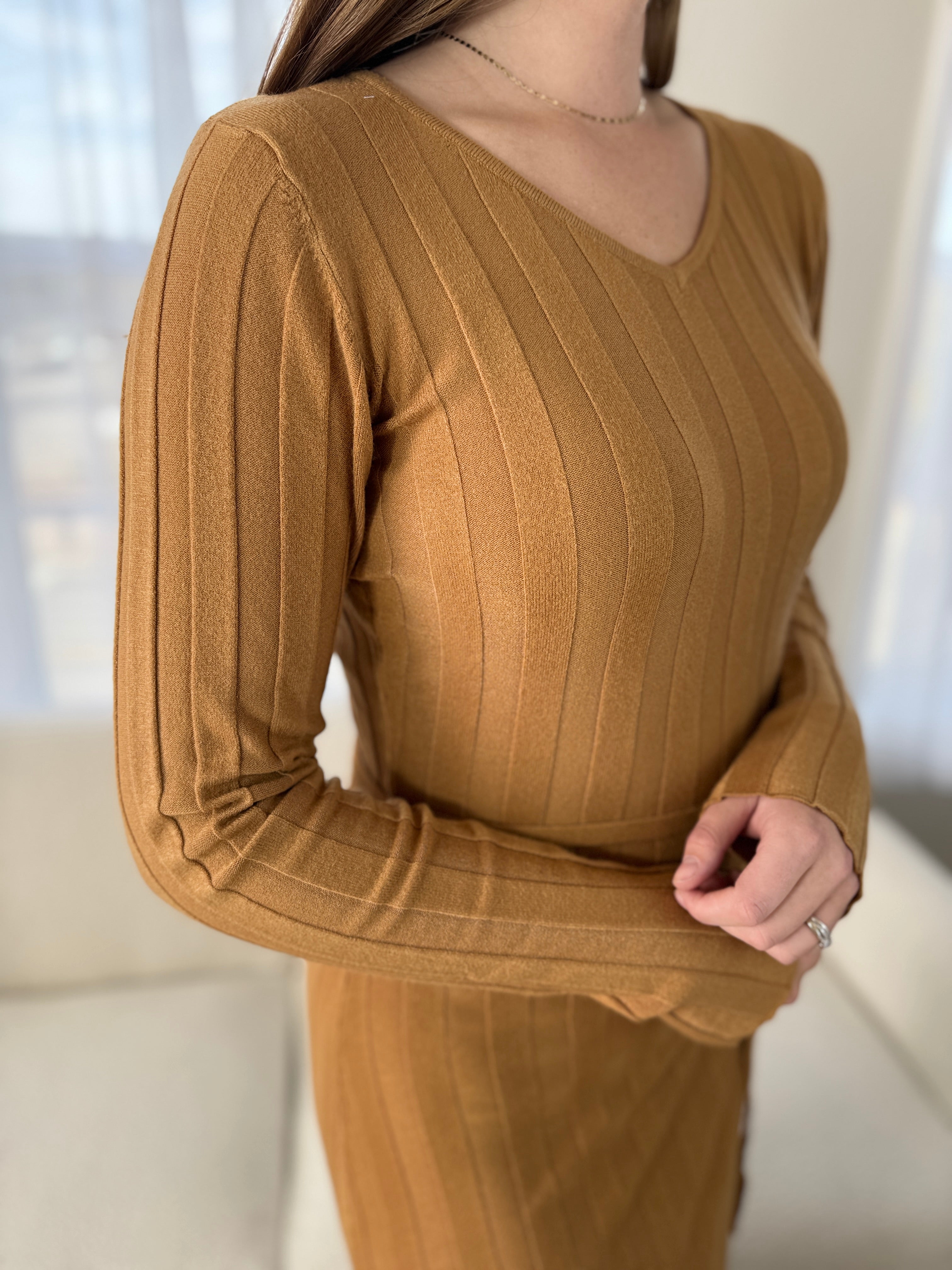 Beautiful v-neck ribbed bodycon dress with tie belt at waist.
