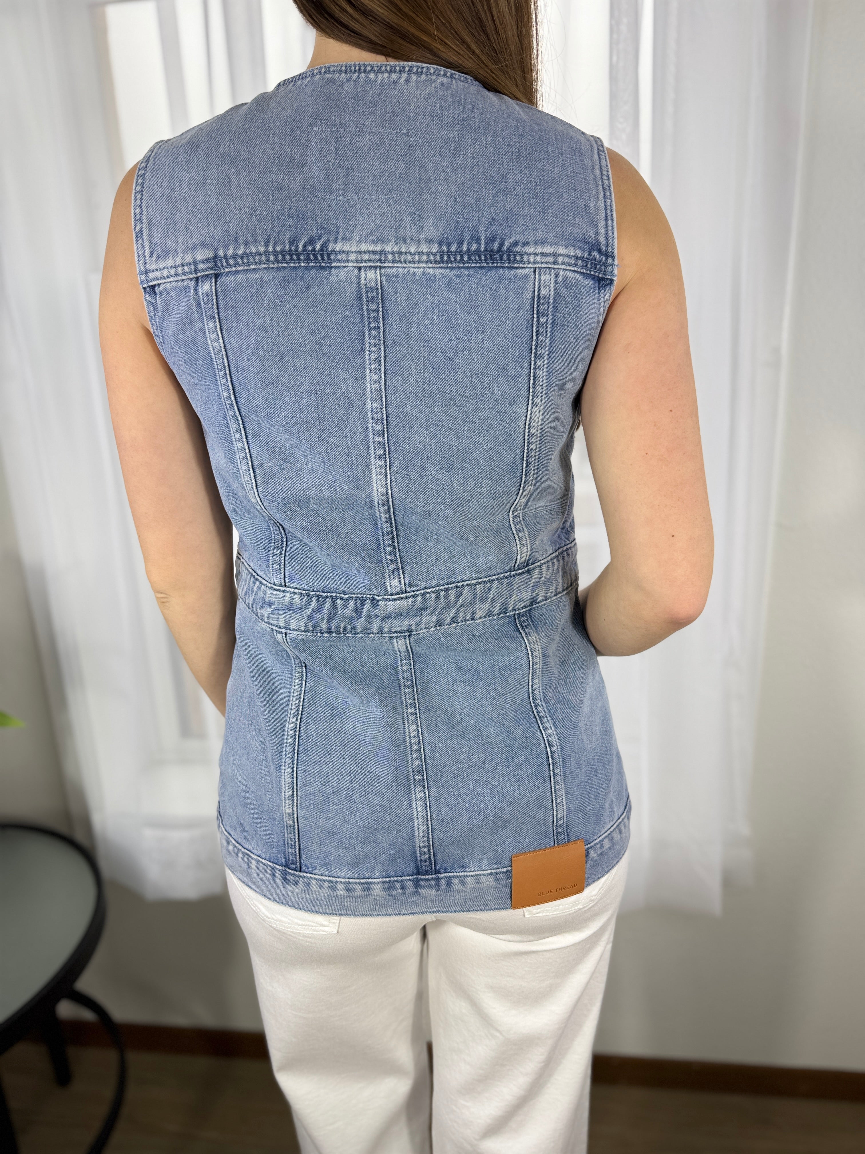 Elevate your layering game with this sophisticated longline denim vest featuring a figure-flattering cinched waist and sleek round neckline. This button-up essential blends utility with high-fashion style, perfect for transitioning seasons with effortless chic.