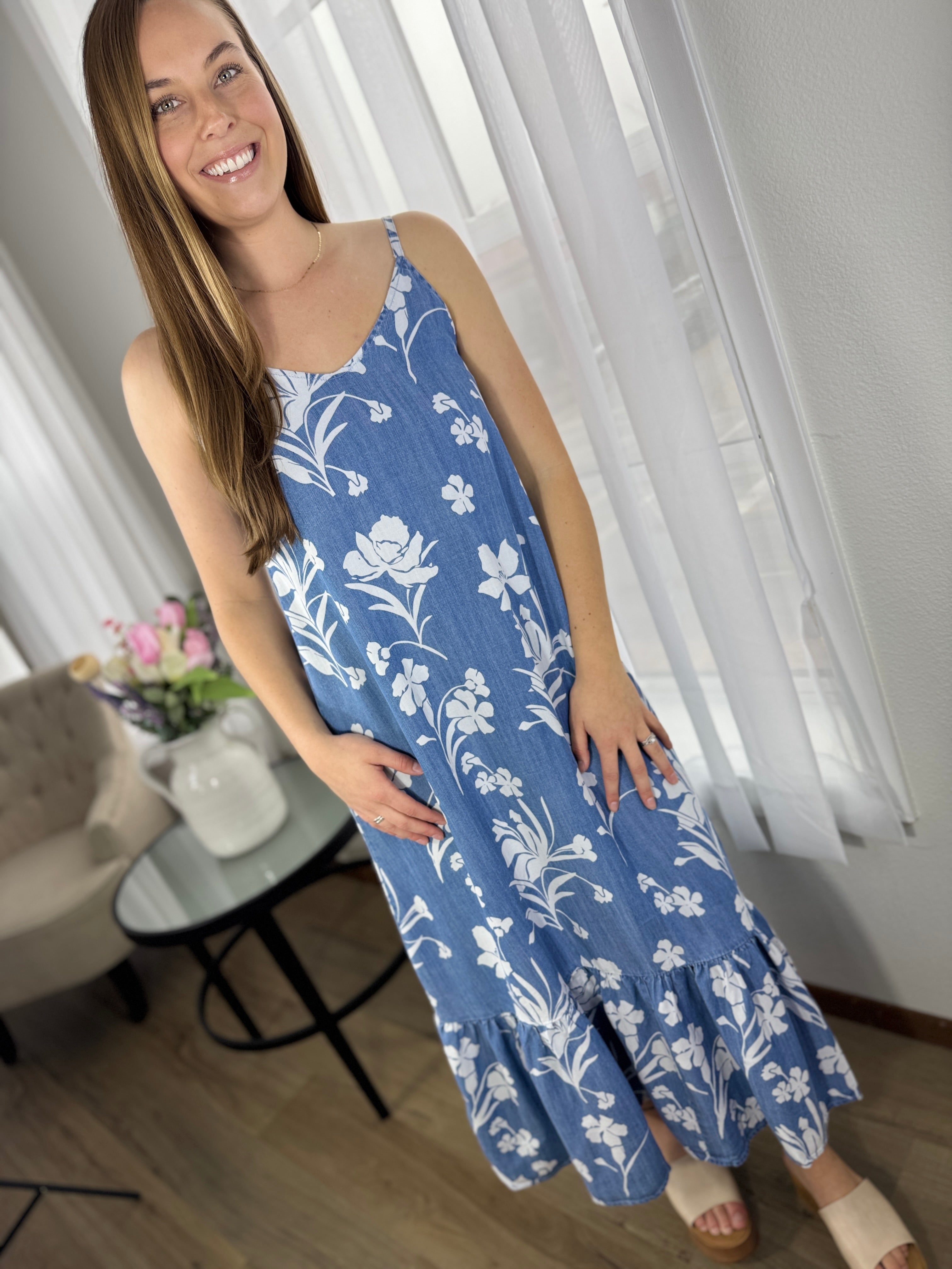 Experience effortless elegance in this eco-friendly Tencel maxi dress featuring a timeless denim-blue floral print and a playful frilled hemline. This breathable silhouette offers a silky-soft drape, making it the ultimate sustainable choice for sun-soaked days and elevated summer evenings.