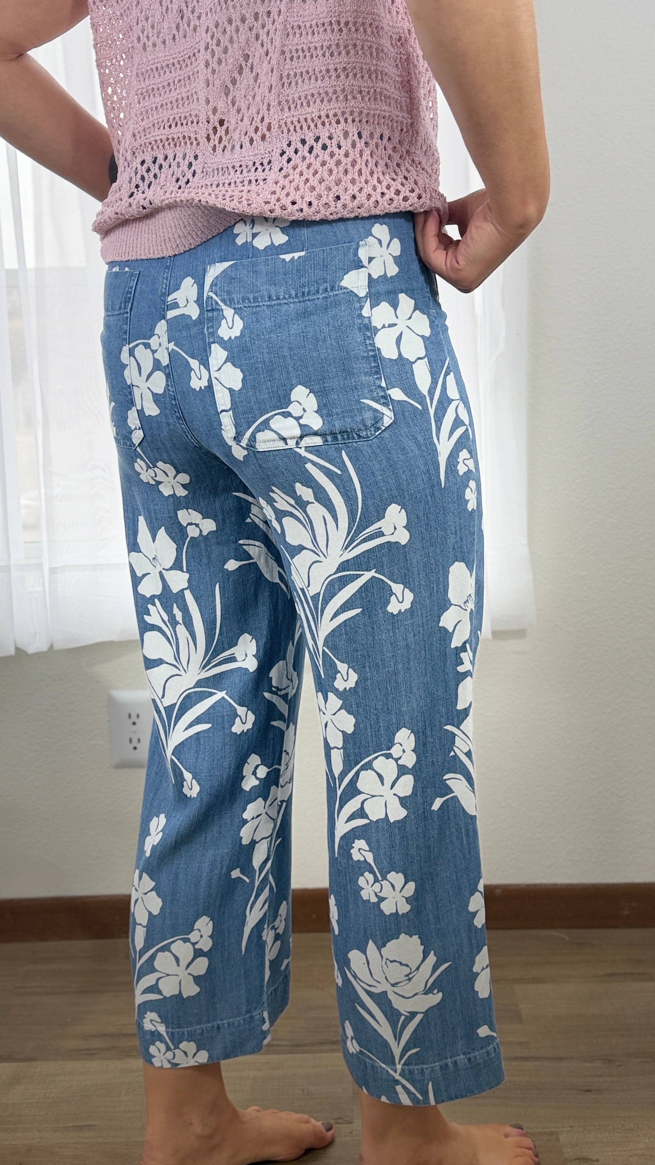 Experience effortless elegance in these ultra-soft Tencel wide-leg crops featuring a striking white floral print. These denim-hued, eco-friendly pants offer a breezy, flattering fit and functional pockets for a perfect blend of sustainable comfort and everyday chic.